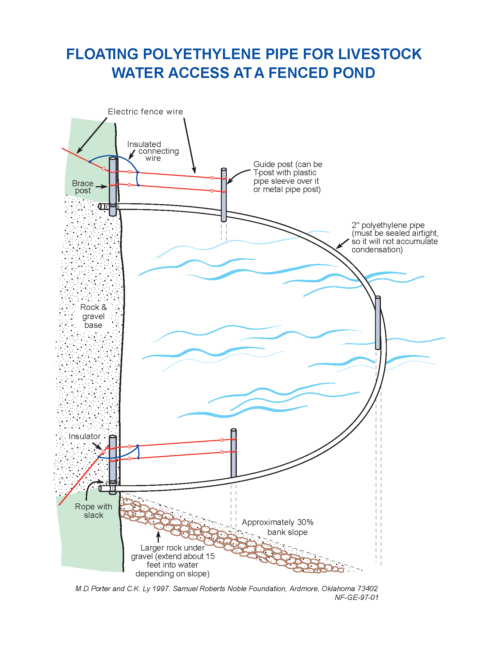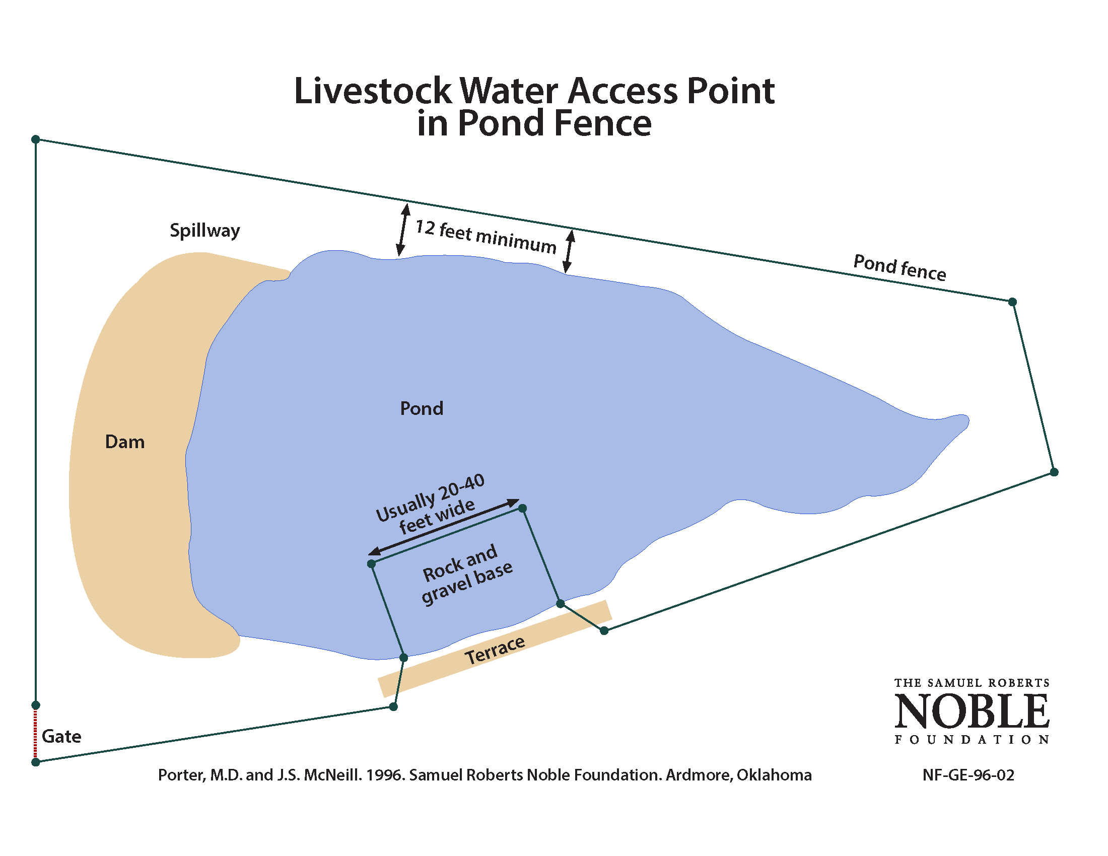 Ponds and streams are common sources of livestock water, but allowing unlimited access can cause severe bank erosion, poor water quality, and other related problems. Livestock prefer clean water and avoid steep or muddy approaches to water whenever possible. Water access sites built with hardened surfaces and fencing can minimize many of the direct access concerns.